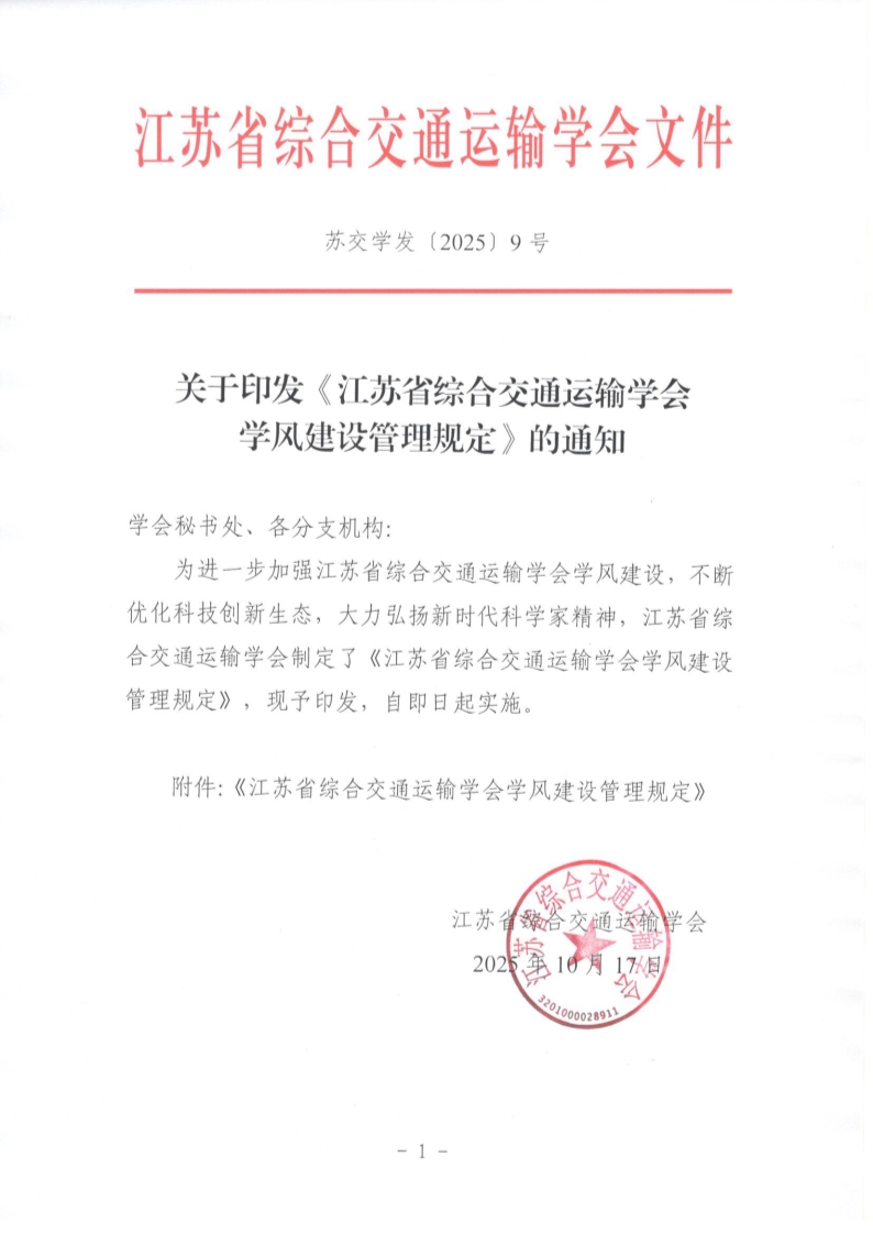 苏交学发〔2025〕9号 关于印发《江苏省综合交通运输学会学风建设管理规定》的通知